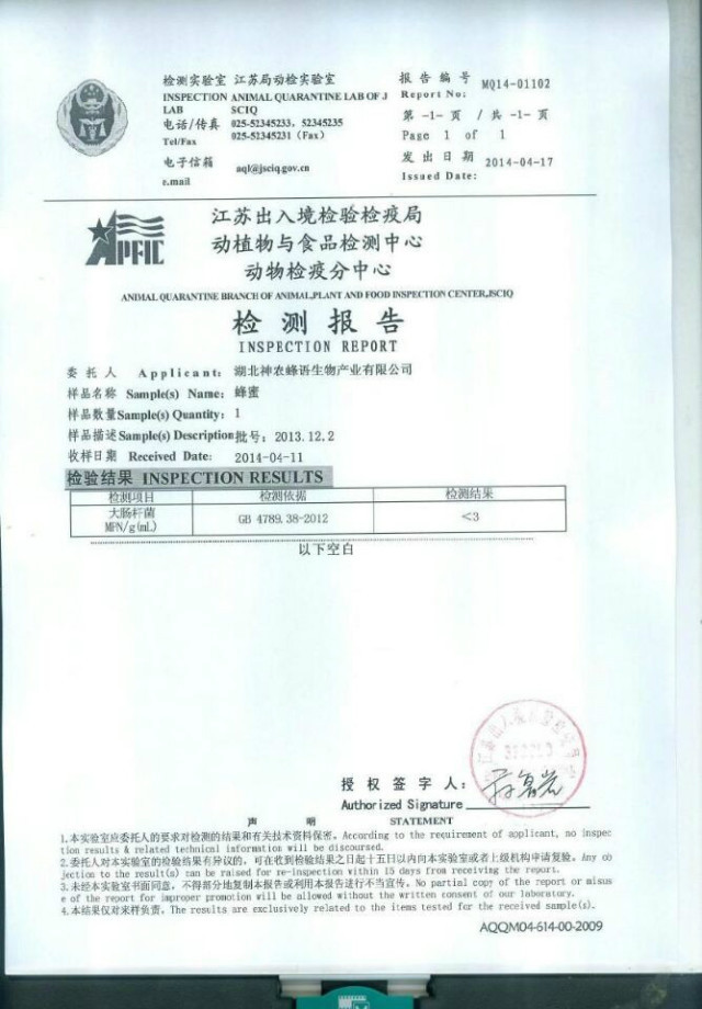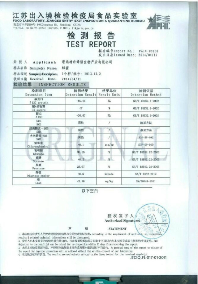 經過耐心等待,神農蜂語總經理宋學喜已拿到江蘇出入境檢驗檢疫局動植物與食品實驗室(中國目前2家檢測蜂蜜Z權威部門之一)對我們公司的蜂蜜做了如下檢測,檢驗結果Q部合格!