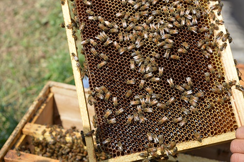 跟著小蜜蜂回到蜂場,看到一排排整齊的蜂箱,好奇的蜂友們都想一窺箱內乾坤。養蜂人朱師傅便打開蜂箱,一股清甜的油菜花蜜味迎面襲來,箱內滿是密密麻麻、有條不紊勞作著的蜜蜂們,釀造的釀造、出勤的出勤,蜂王則忙著產卵培育新兵……在它們的辛勤勞動下,已經有晶亮濃稠的蜂蜜釀造了出來,惹人垂涎,朱師傅掰下幾塊巢脾蜜給蜂友品嘗,這新鮮香濃的春天味道,真是讓人欲罷不能??!