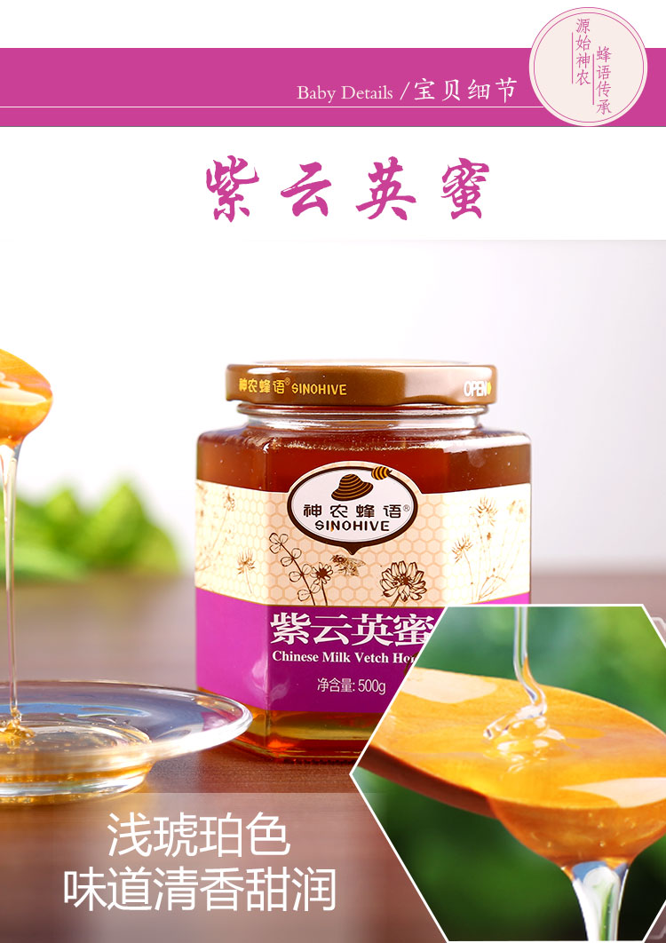紫云英蜜色澤為淺琥珀色,結晶顆粒白色細膩;具有大自然清新宜人的草香味,甜而不膩,鮮潔清甜為一等蜜,深受國內外市場歡迎。有祛風明目,健脾益氣,解毒止痛,殺菌消炎等特殊保健功效。對風痰咳嗽、喉痛、火眼痔瘡等有一定的輔助療效,是虛火旺盛人士之保健佳品。