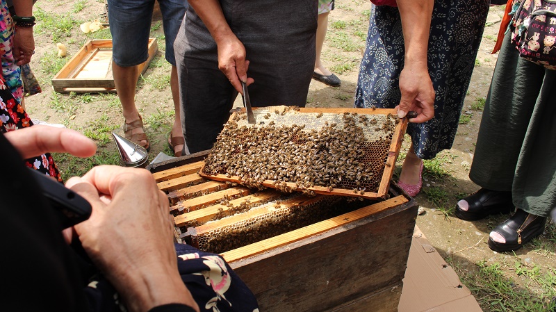 首批武漢社區游客到蜂緣山莊觀光品蜜