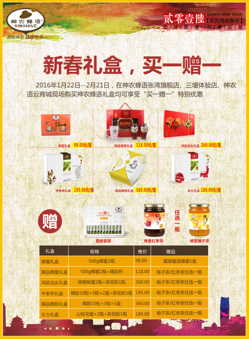 溫馨提示:“新春禮盒,買一送一”將持續到2月21日,喜歡的朋友也可以到神農蜂語張灣旗艦店、三堰體驗店以及微信云商城選購!