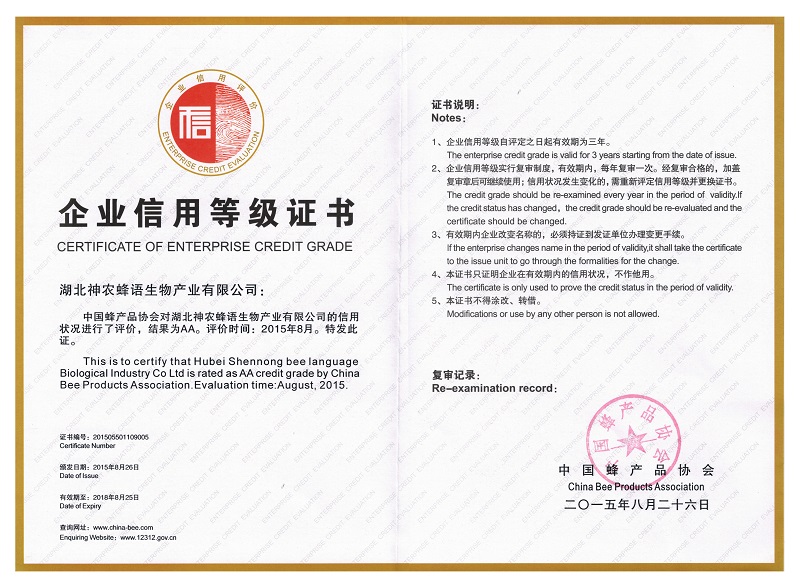 在企業自愿申報的基礎上,堅持“公平、公正、公開”的原則,經第三方專業評價機構——中國出口信用保險公司認真、客觀的評估和信用評價工作委員會審議,初步確定第九批企業信用等級評價結果,并將評價結果在中國市場秩序網(www.antifraud.gov.cn)、中國蜂產品協會網(www.china-bee.com)、《中國蜂產品報》及相關媒體和網站上向社會進行公示。Z終確定北京知蜂堂蜂產品有限公司等7家企業獲得A級以上信用等級(有效期自2015年8月26日至2018年8月25日)。評價結果已在商務部商務信用信息交換共享平臺備案,并在中國市場秩序網上公布。